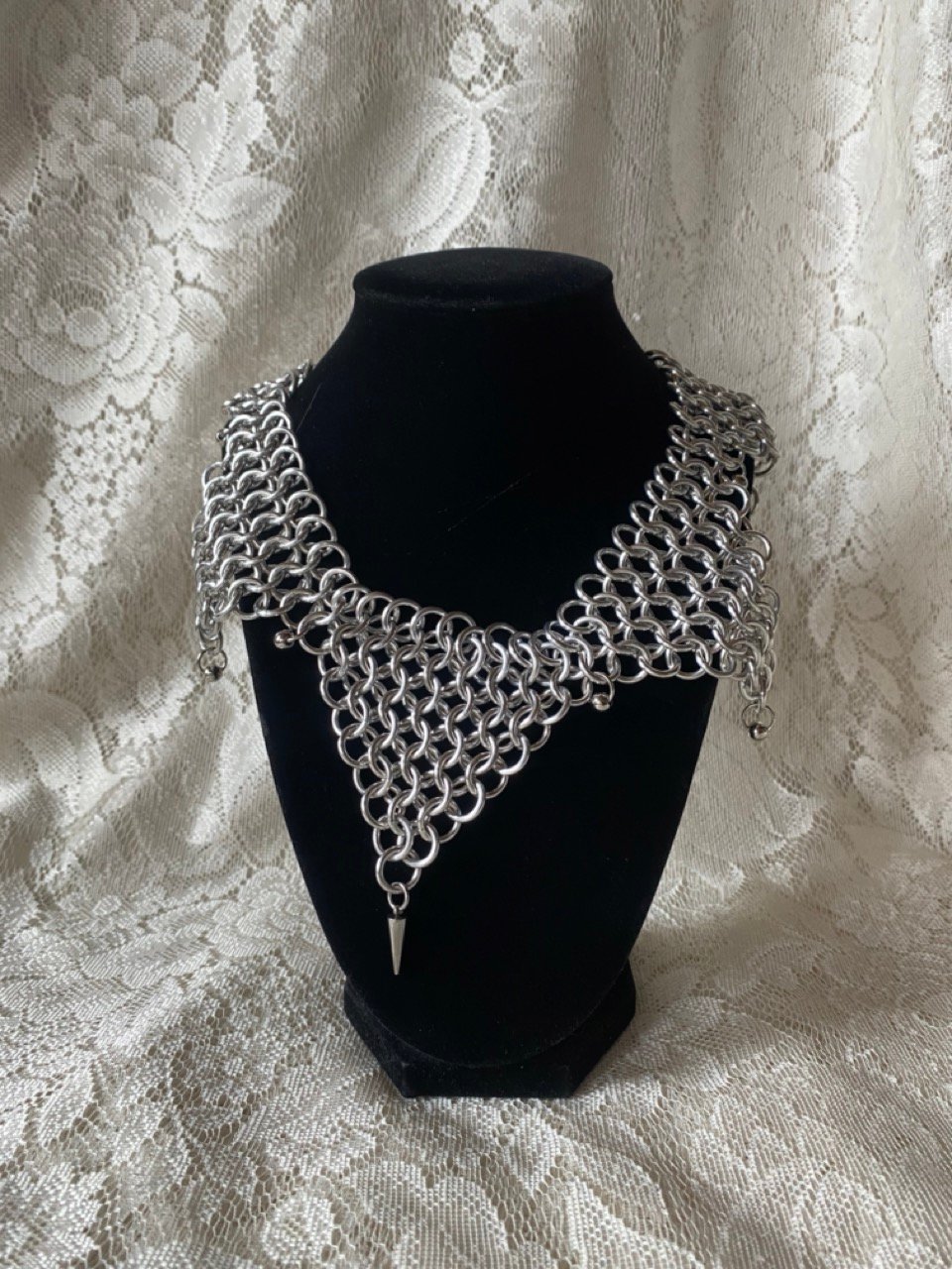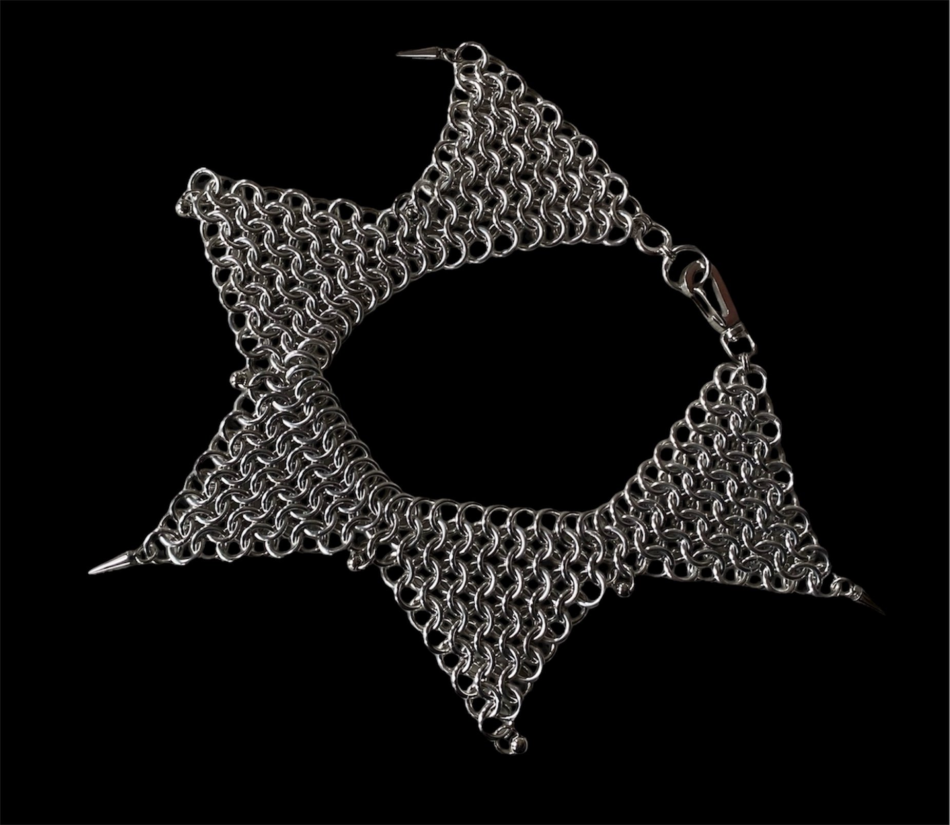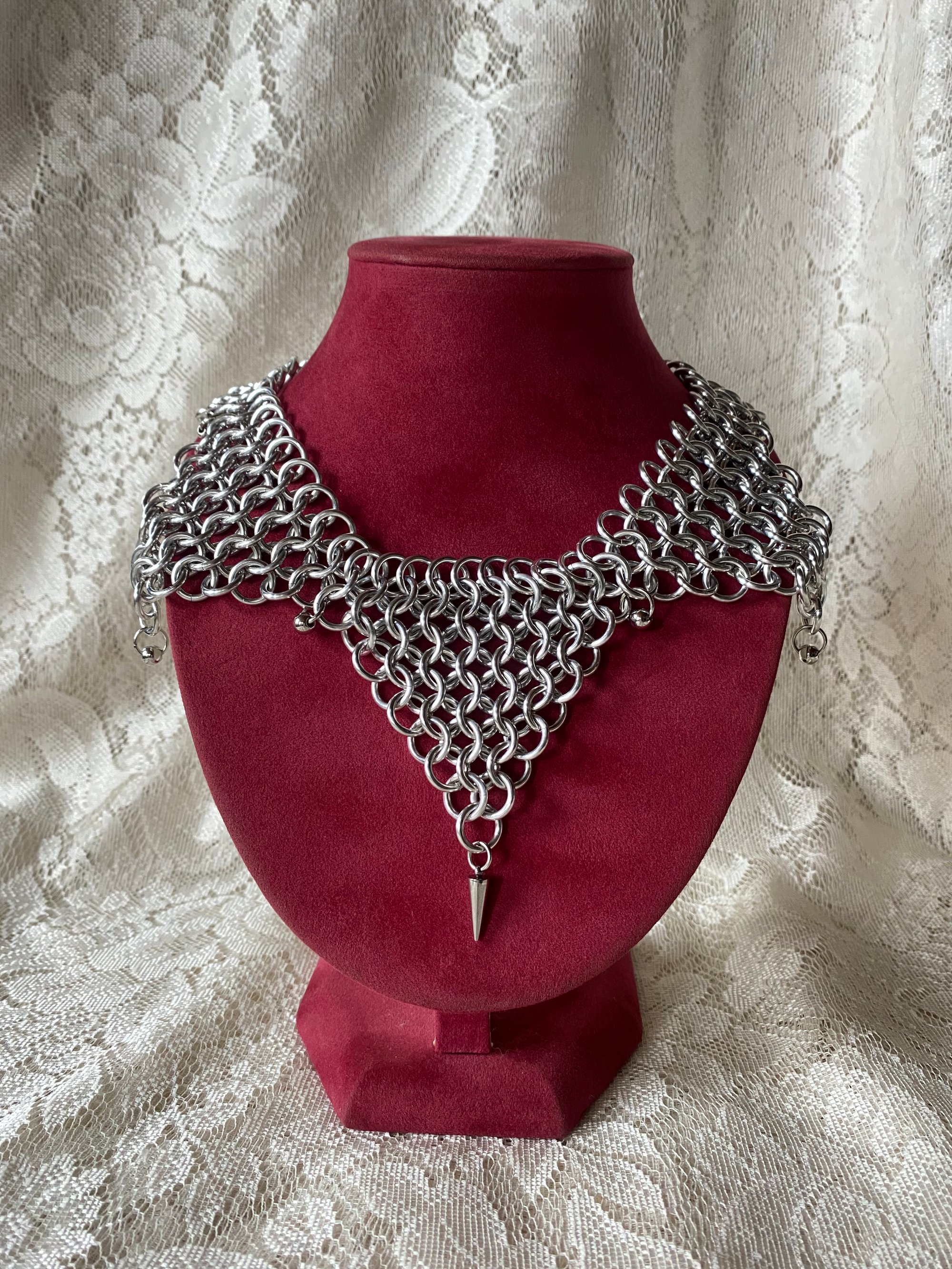 All aluminum rings with stainless steel spikes and hardware. Lightweight and hypoallergenic. Currently sized at 19.5" and can be slightly adjusted bigger or smaller.