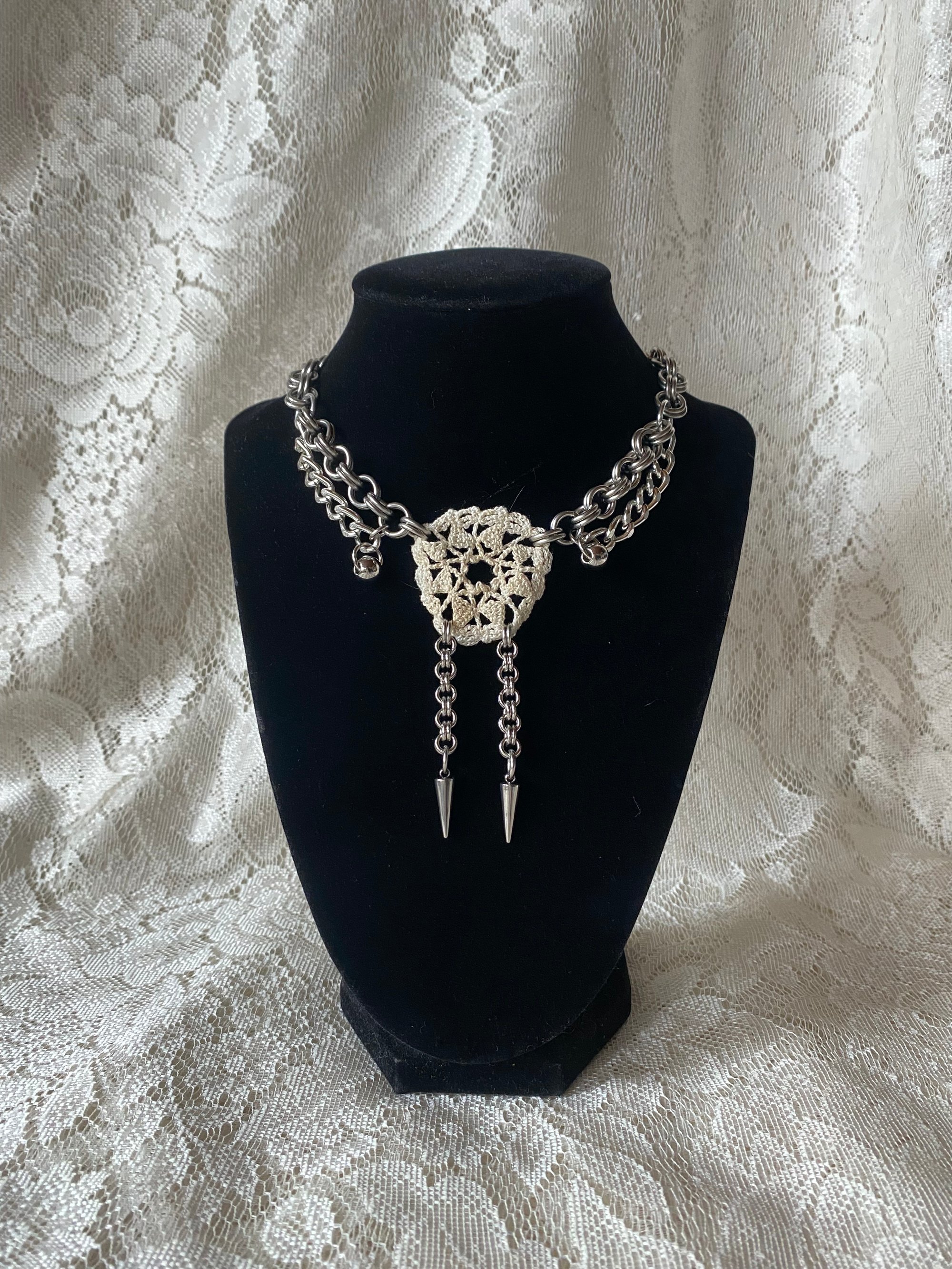 Doiles handmade by @heavenlygatedheart ♡ Stainless steel and aluminum rings, stainless steel spikes, hardware. Sized at 15" and can be sized up.